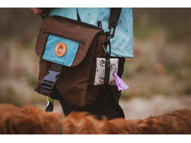 Zásobník bezpečne uchová štandardnú rolku, sáčky sú vedené cez hrdzi odolné očko a zatvára sa na zips (s extra dlhým ťaháčikom pre ľahký úchop). Karabínkou ho pripnete k vôdzke, kľúčom, pútku nohavíc, batohu či tréningovej veste – všade tam, kde ho potrebujete mať po ruke.